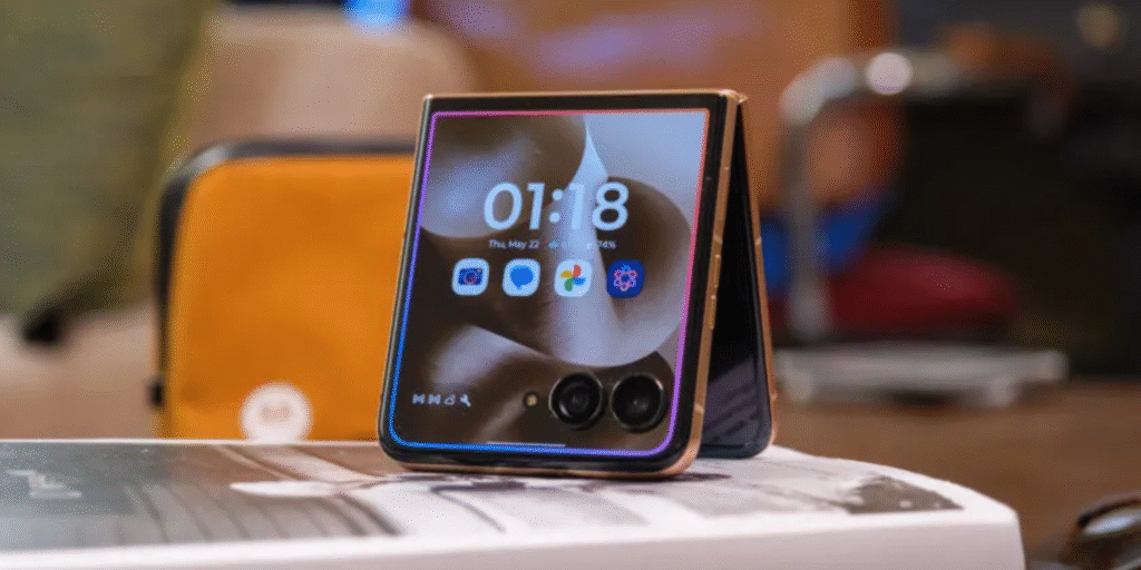 O Razr Ultra combina hardware potente com design dobrável. Aberto, tem tela principal de 7 polegadas. Fechado, ocupa metade do espaço e permite uso da tela externa de 4 polegadas.